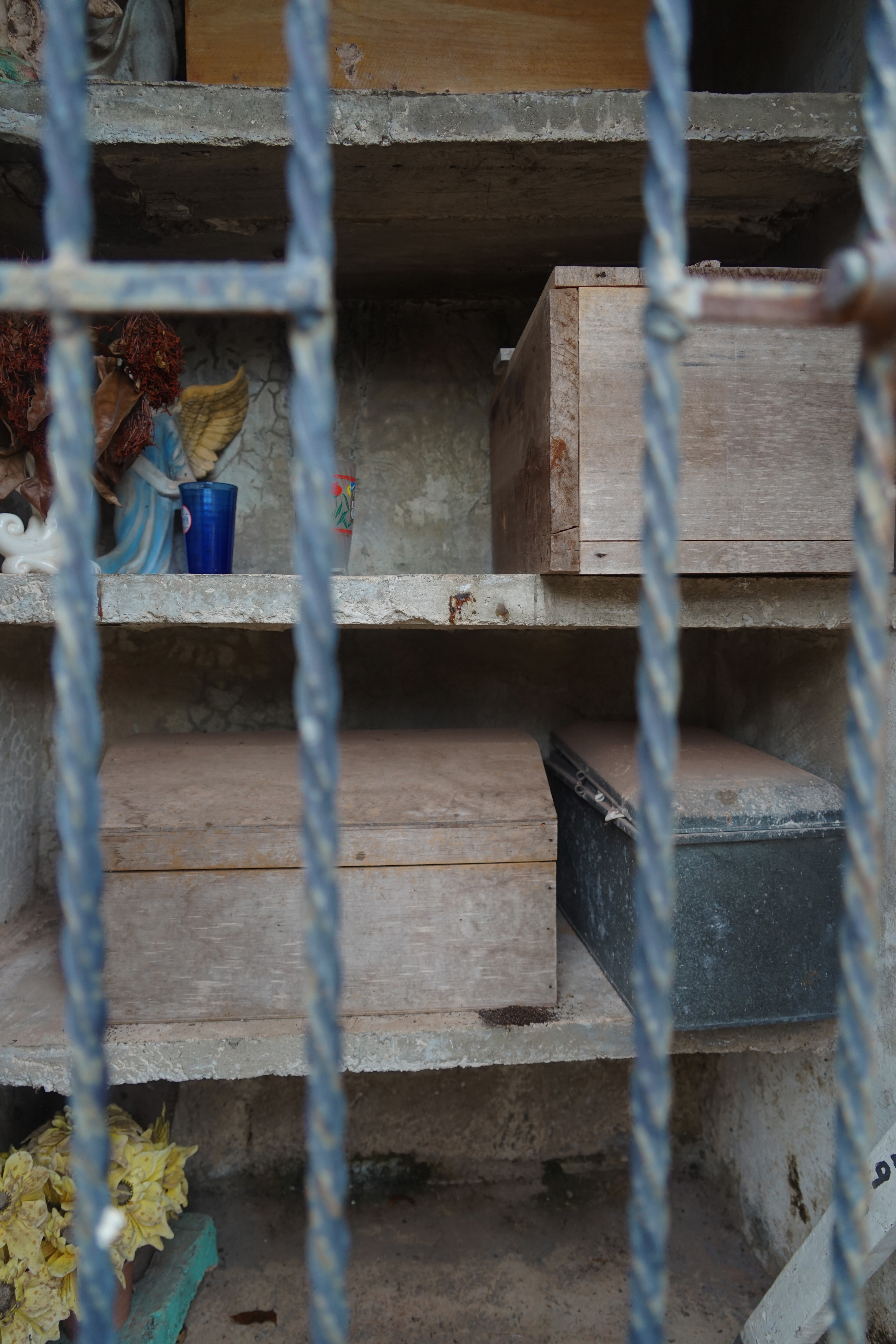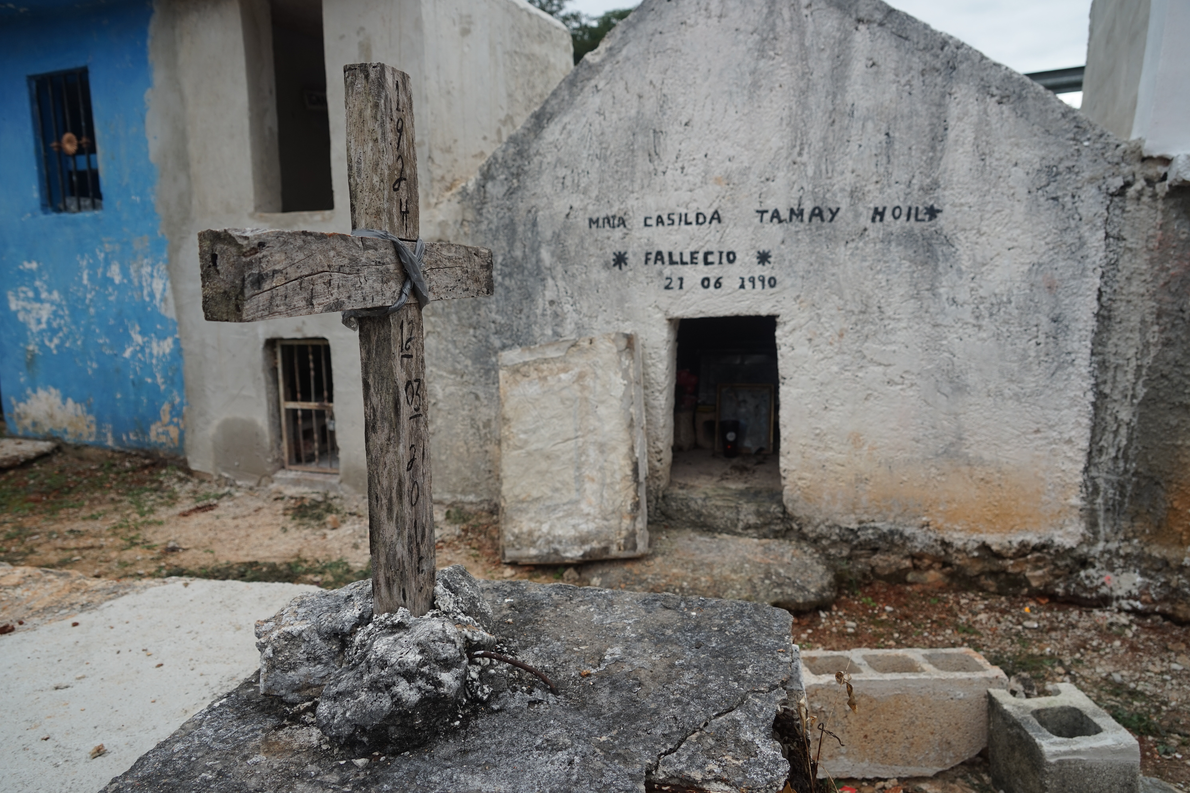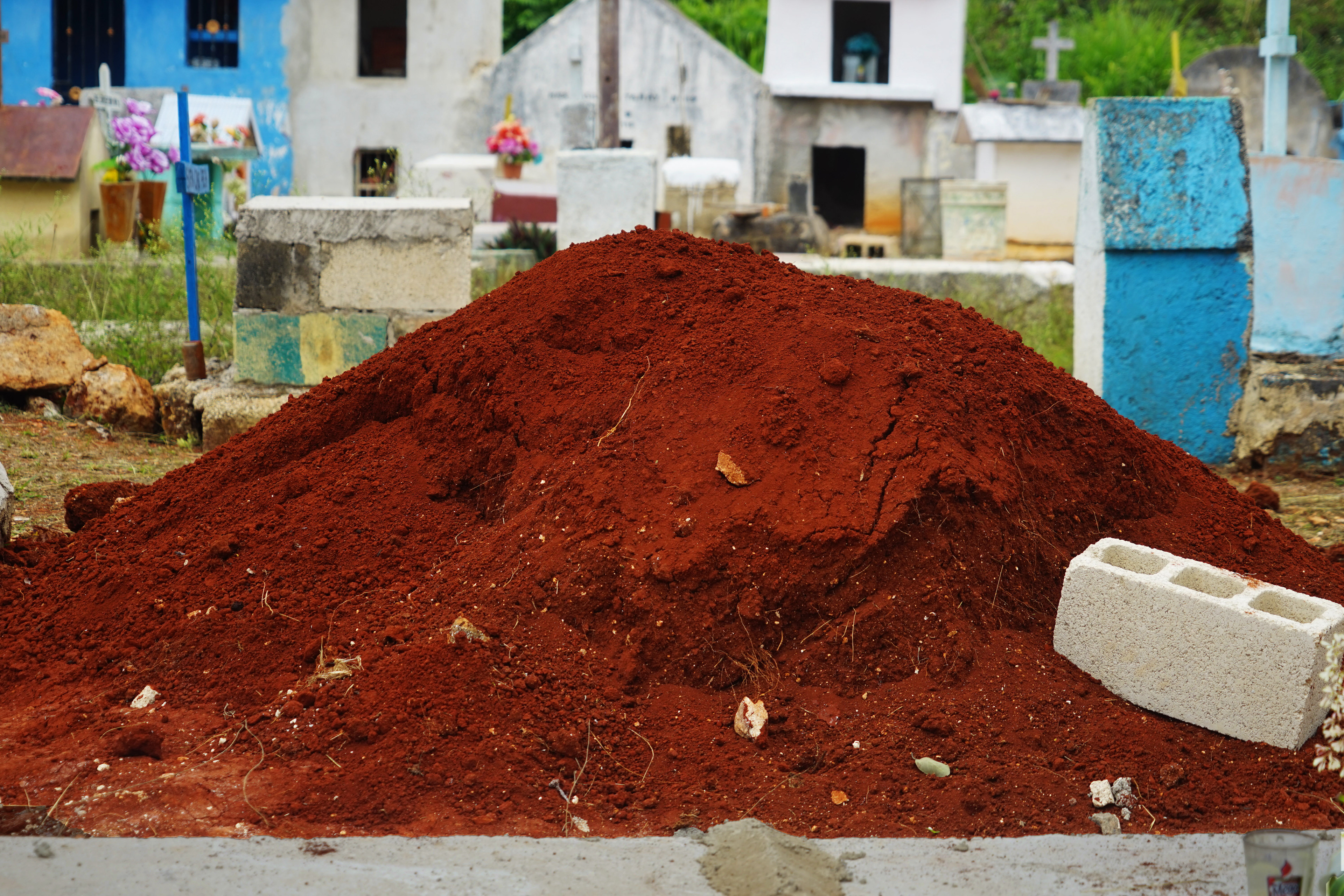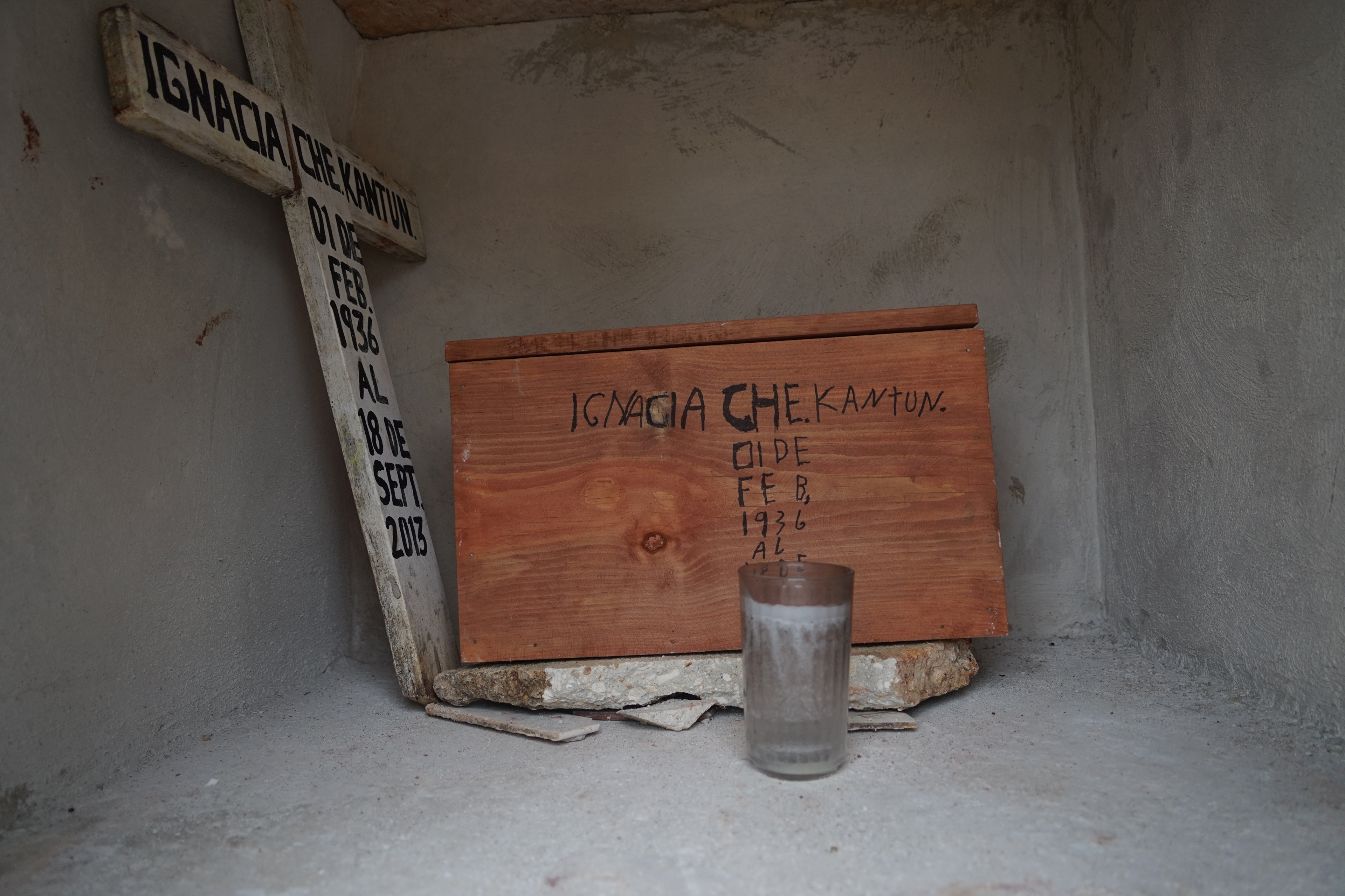 Cemeteries Somewhere in the Yucatán, Mexico Riding my bike along a 2 lane highway I maneuvered my way to a cemetery that caught my eye. Innocently enough the bright colors were first to catch my attention. Entering the gates I knew I was somewhere special. I knew because my heart was pounding even before my eyes could take it all in. I stopped in my tracks puzzled and trying to decipher why the coffins were so small and uncovered. My first reaction was I happened upon a child's cemetery. Investigating the dates I was glad to be wrong. What I learned is, when a loved one dies they are buried in a full casket. After the third year, the family excavates the loved one to sift through the decomposed remains for bones. In few regions they practice bone washing. Bone washing (dry brush cleansing) in these very few regions is done every year forward in preparation for Hanal Pixan, the Mayan's Dia de los Muertos celebration that welcomes home the spirits of loved ones passed. Hanal Pixan translates to "Food of Souls". The bones are then carefully stacked on a clean light cloth and tied as is or placed in a wooden or metal box and added to the family tomb or mausoleum. The lid is then placed slightly ajar or off completely to the side. Year round candles stay lit and flowers are placed to honor them til their spirit is able to visit again the next Hanal Pixan. Here the soil is a striking red as it is derived from limestone and contains iron. My heart was right; I was indeed somewhere special.