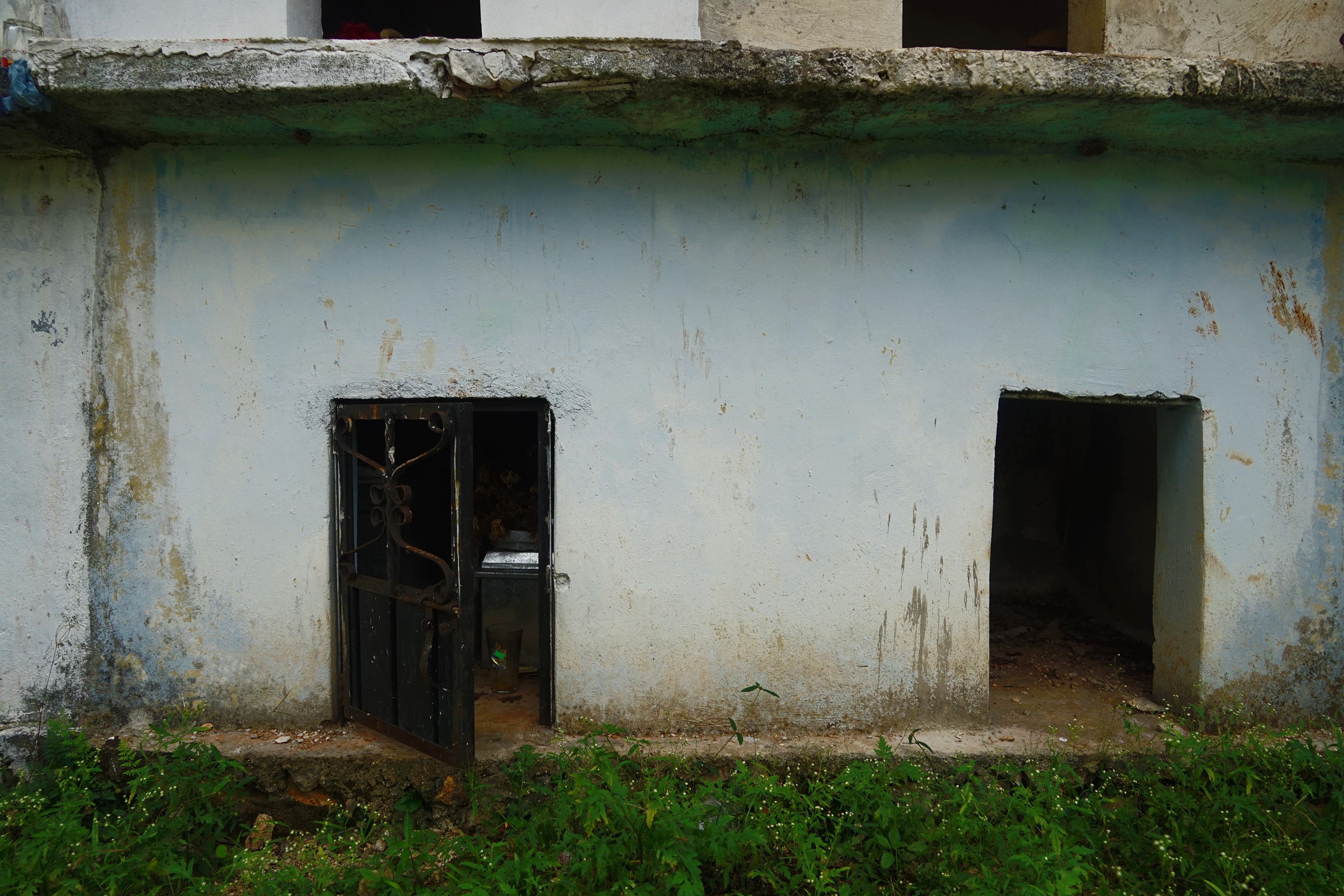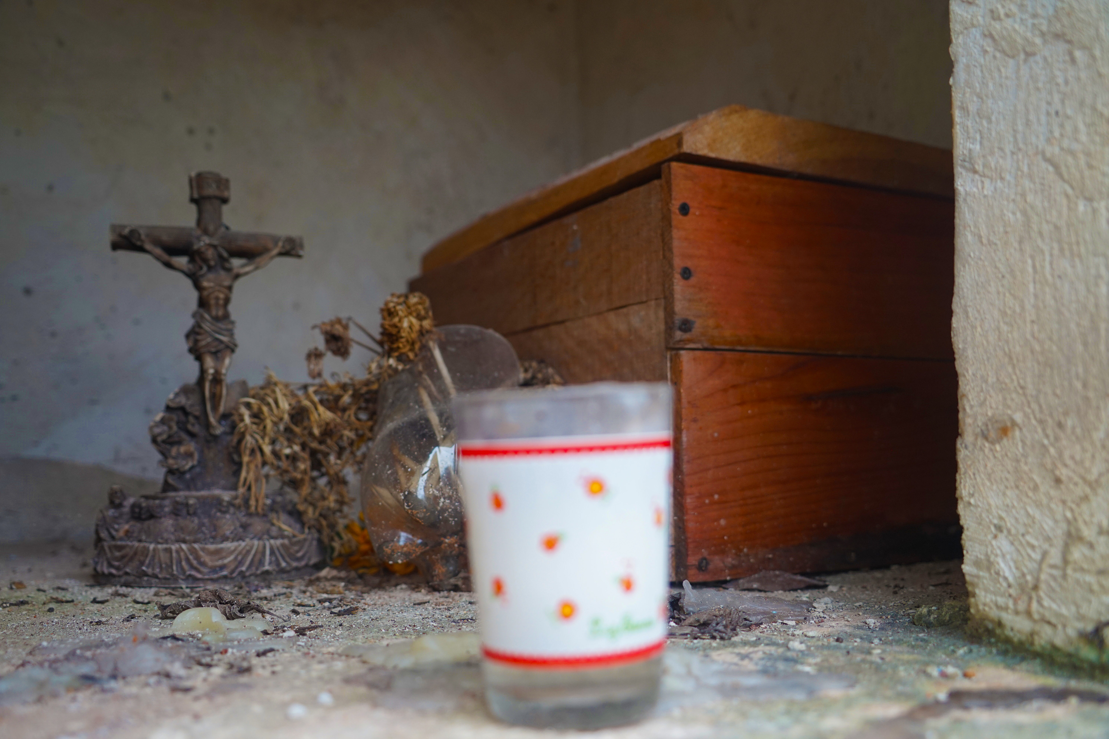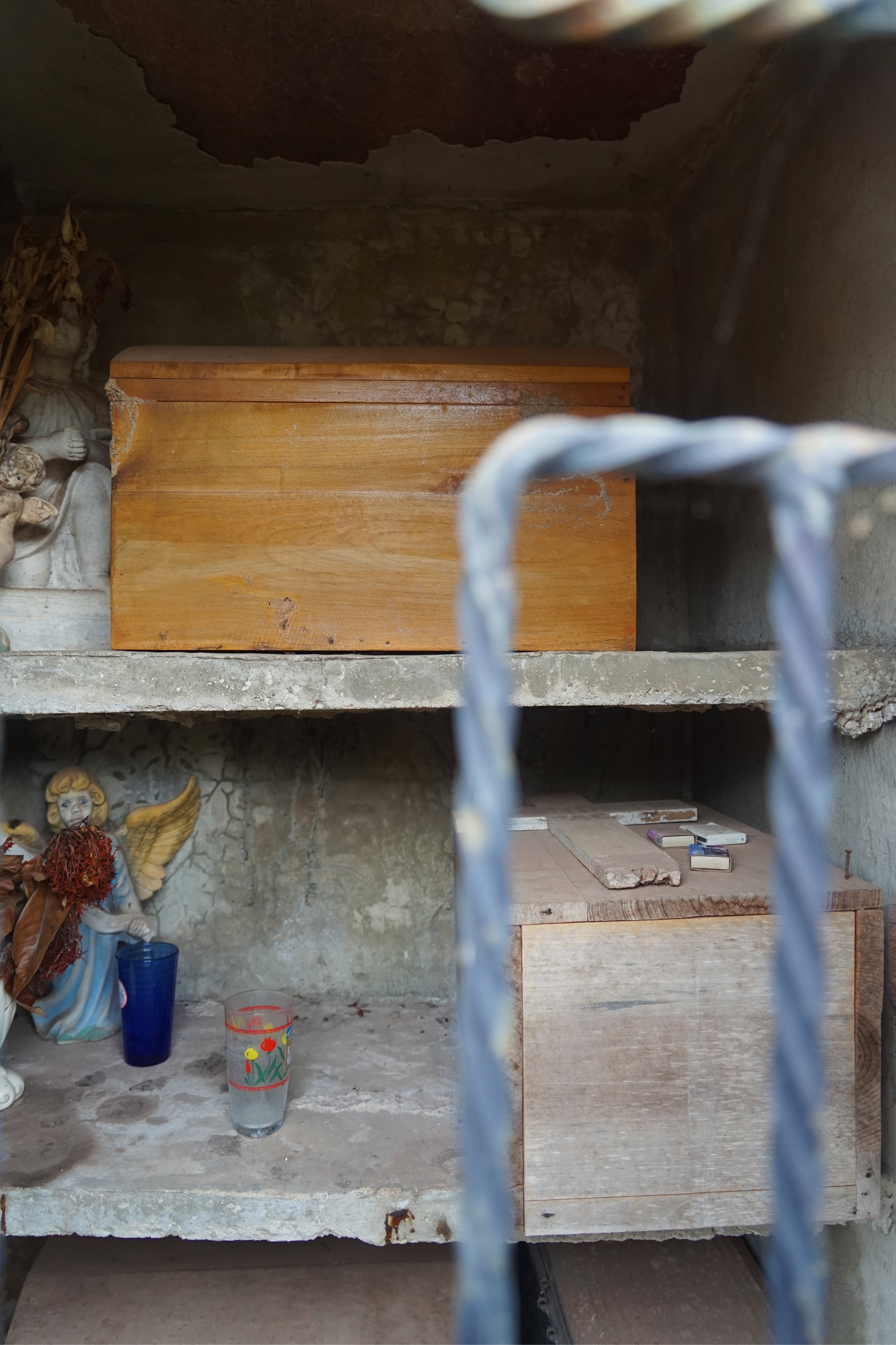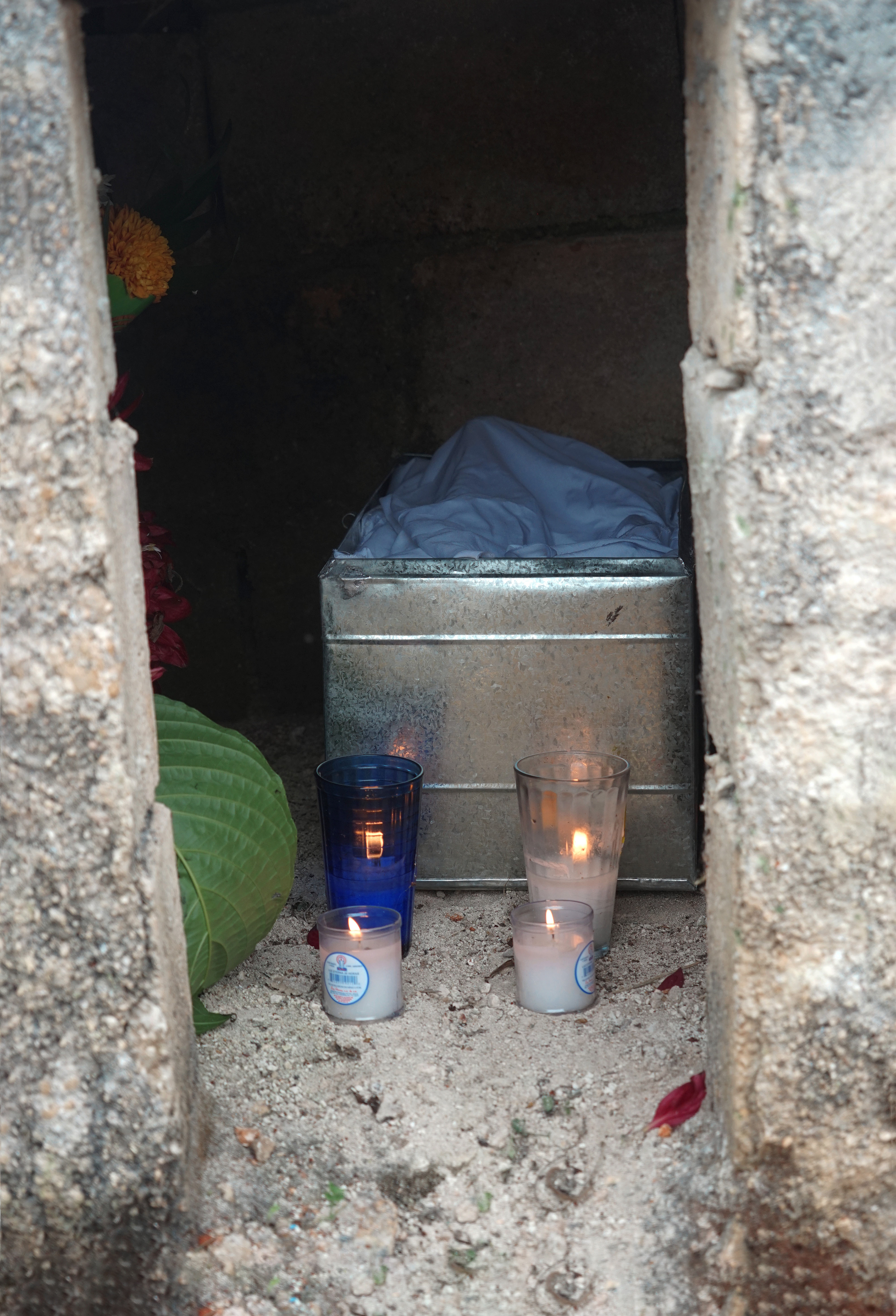 Cemeteries Somewhere in the Yucatán, Mexico Riding my bike along a 2 lane highway I maneuvered my way to a cemetery that caught my eye. Innocently enough the bright colors were first to catch my attention. Entering the gates I knew I was somewhere special. I knew because my heart was pounding even before my eyes could take it all in. I stopped in my tracks puzzled and trying to decipher why the coffins were so small and uncovered. My first reaction was I happened upon a child's cemetery. Investigating the dates I was glad to be wrong. What I learned is, when a loved one dies they are buried in a full casket. After the third year, the family excavates the loved one to sift through the decomposed remains for bones. In few regions they practice bone washing. Bone washing (dry brush cleansing) in these very few regions is done every year forward in preparation for Hanal Pixan, the Mayan's Dia de los Muertos celebration that welcomes home the spirits of loved ones passed. Hanal Pixan translates to "Food of Souls". The bones are then carefully stacked on a clean light cloth and tied as is or placed in a wooden or metal box and added to the family tomb or mausoleum. The lid is then placed slightly ajar or off completely to the side. Year round candles stay lit and flowers are placed to honor them til their spirit is able to visit again the next Hanal Pixan. Here the soil is a striking red as it is derived from limestone and contains iron. My heart was right; I was indeed somewhere special.